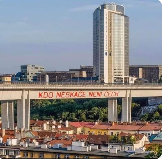 Hasło, które widzicie jest chyba najpopularniejszym patriotyczno-sportowym hasłem w tym kraju – „Kto nie skacze nie jest Czechem”. Dłuższa wersja brzmi „Kto nie skacze, nie jest Czechem. Hop, hop, hop” i towarzyszy jej masowe skoordynowane podskakiwanie kibiców. Jako przyśpiewka został po raz pierwszy użyty w 1996 roku, aby uczcić zdobycie srebrnego medalu na EURO 1996. Okrzyk stawia znaczne wymagania co do jakości trybun. Na przykład w O2 Arena w Pradze skoki kibiców podczas imprez mistrzowskich przez lata kosztowały miliony koron na rekonstrukcję.